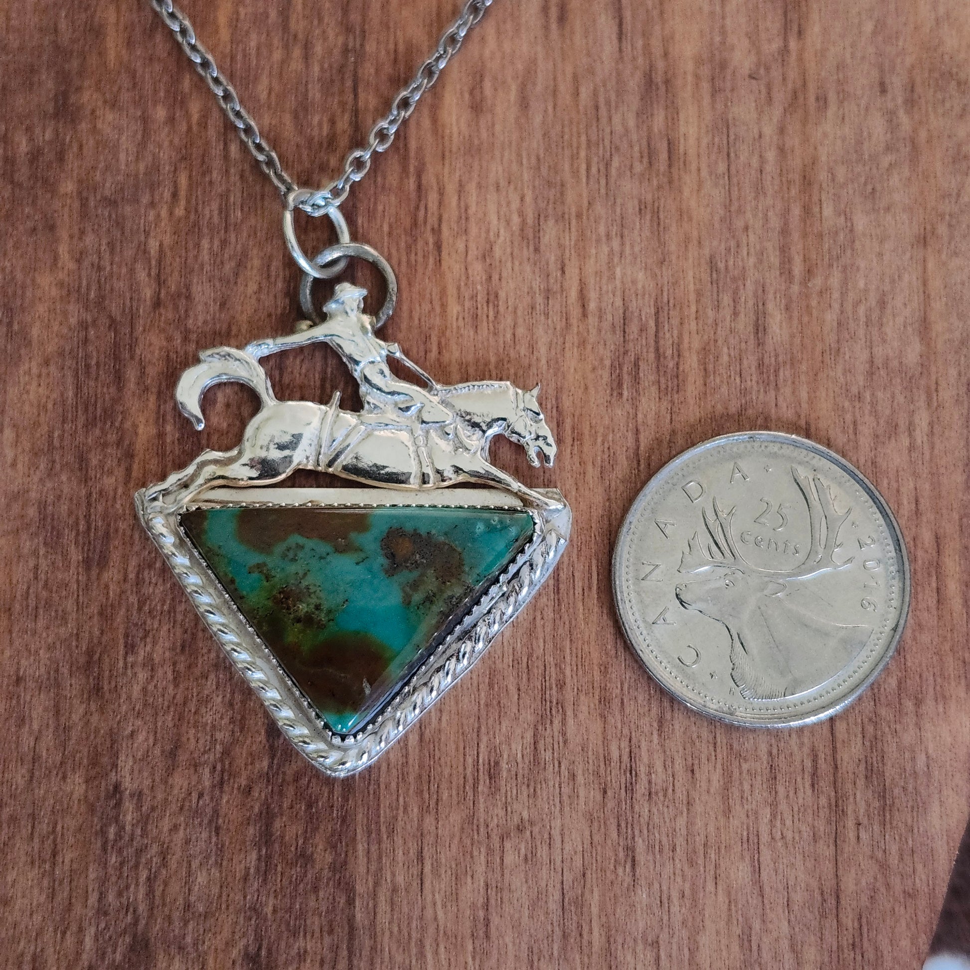 Pendentif en argent sterling 925 orné d'une pierre triangulaire de turquoise de la mine Kingman en Arizona fait à la main au Québec. Un ornement en argent sterling en forme de cowboy sur son cheval qui "buck" est monté sur le pendentif.