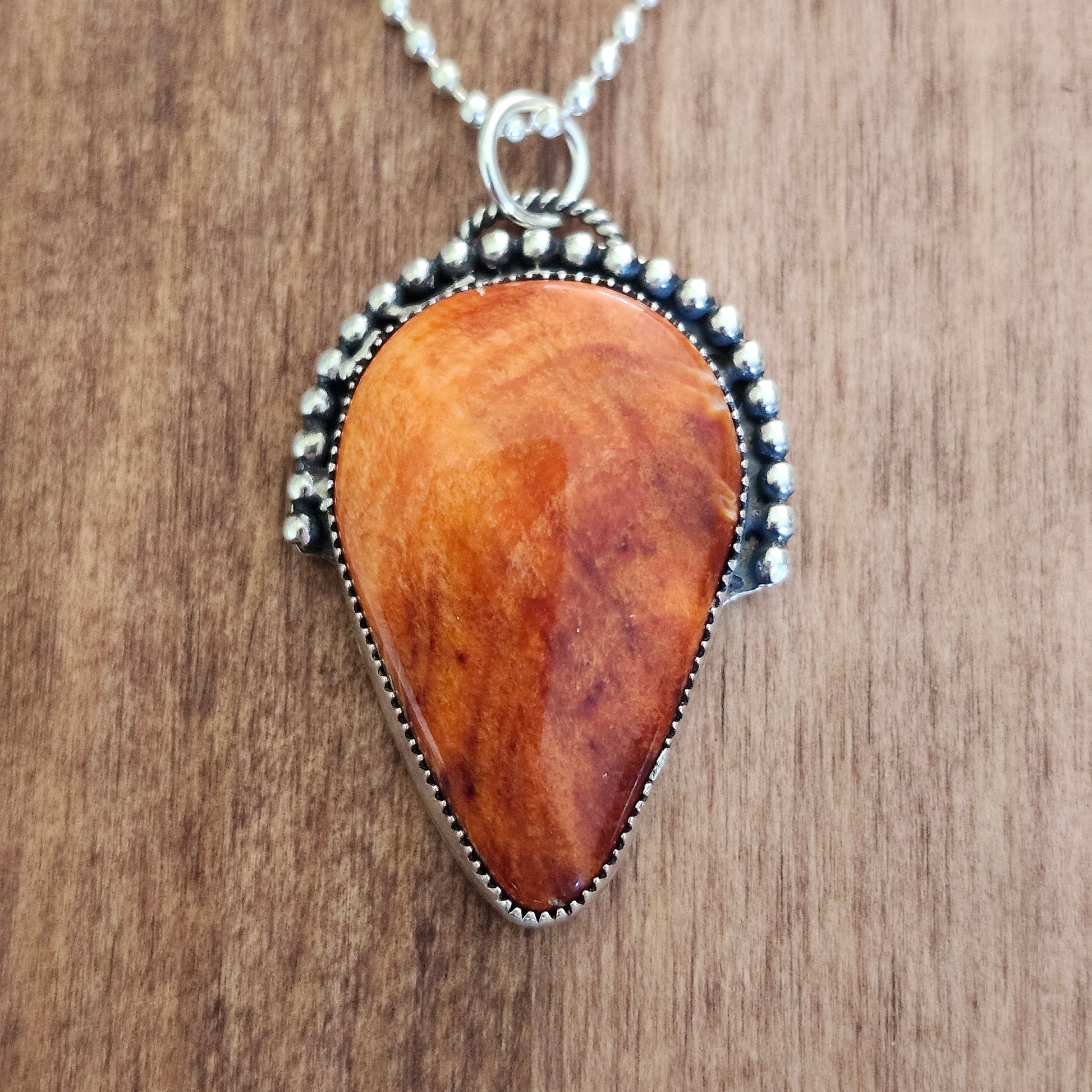 Pendentif en argent sterling 925 orné d'une pierre de coquille d'huître épineuse taillée. Le pendentif est fait à la main au Québec.