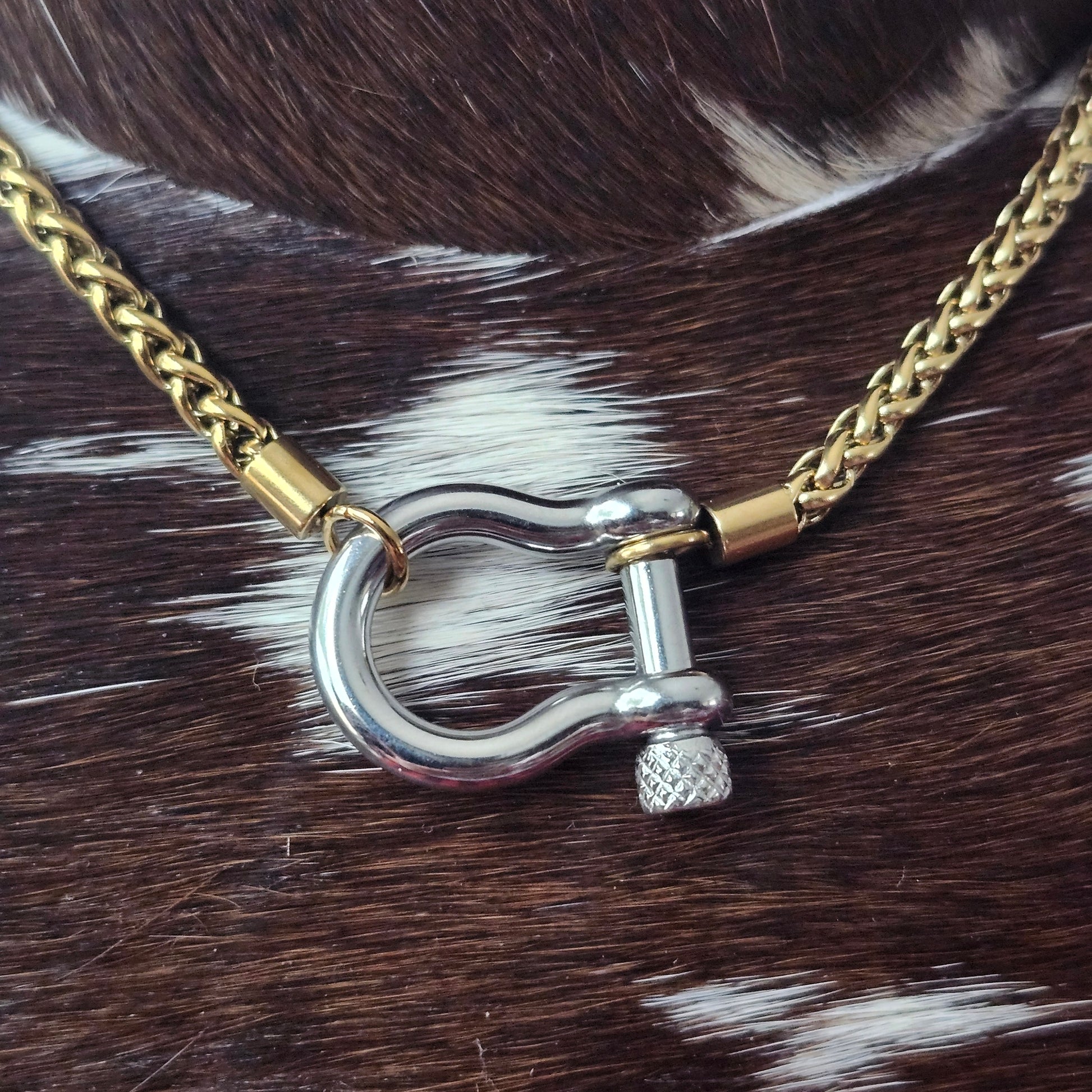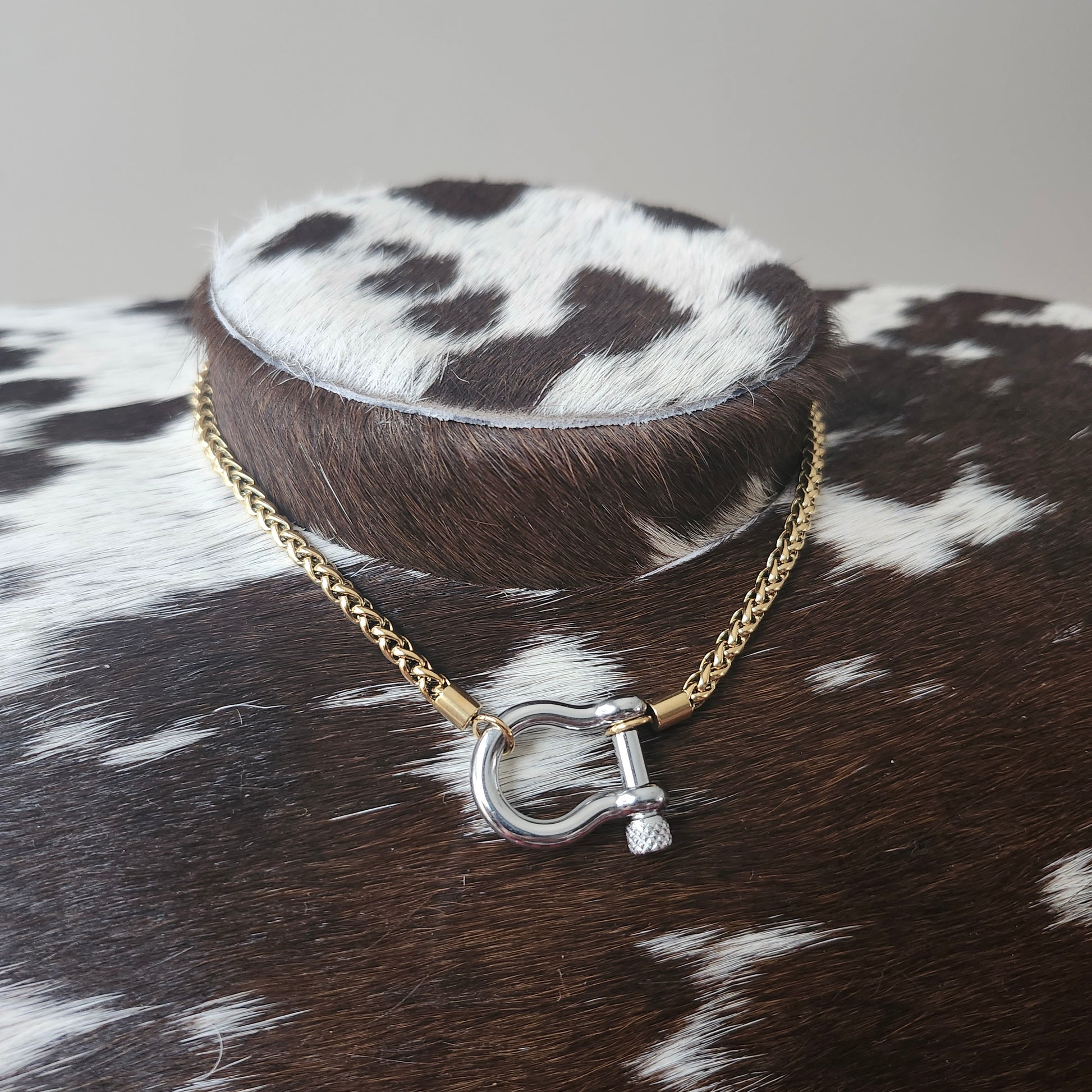 Ce collier en acier inoxydable présente une chaîne style corde de blé avec un mousqueton en forme de D pour ajouter vos propres charms, ou pour superposer avec d’autres colliers.