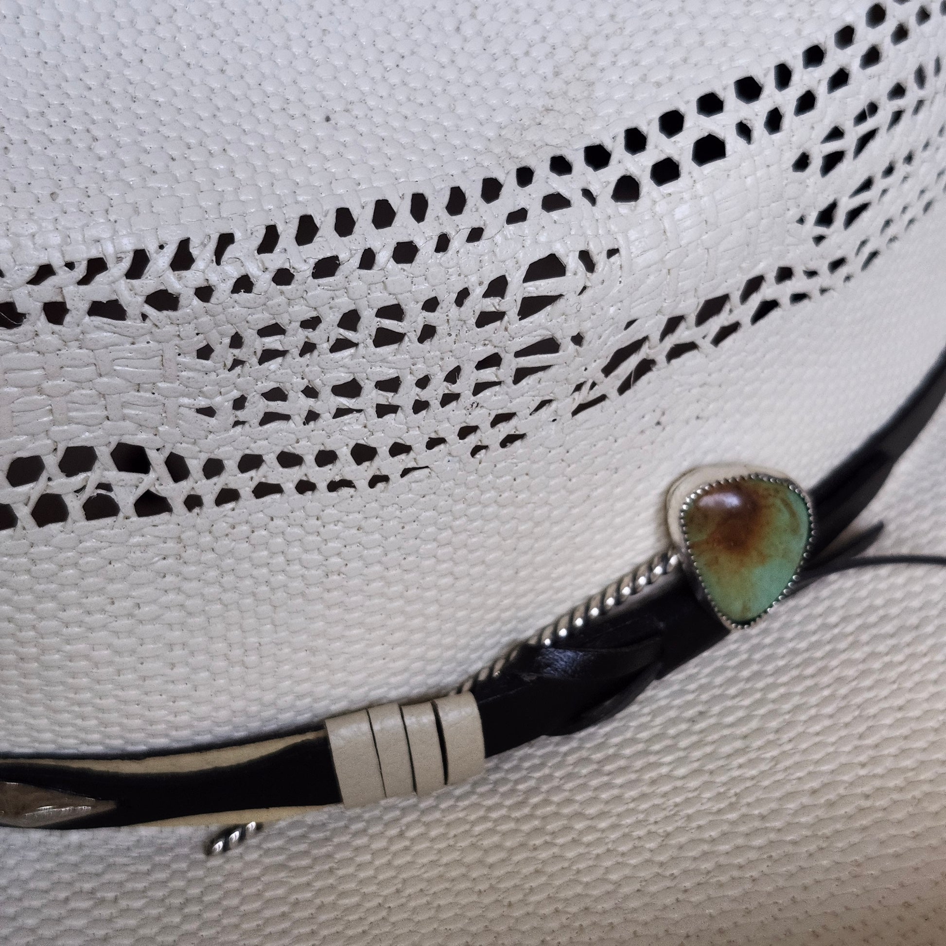 Ce petit bijou, conçu en argent sterling 925 et orné d'une pierre de turquoise mexicaine, se place derrière la bande de votre chapeau de cowboy.