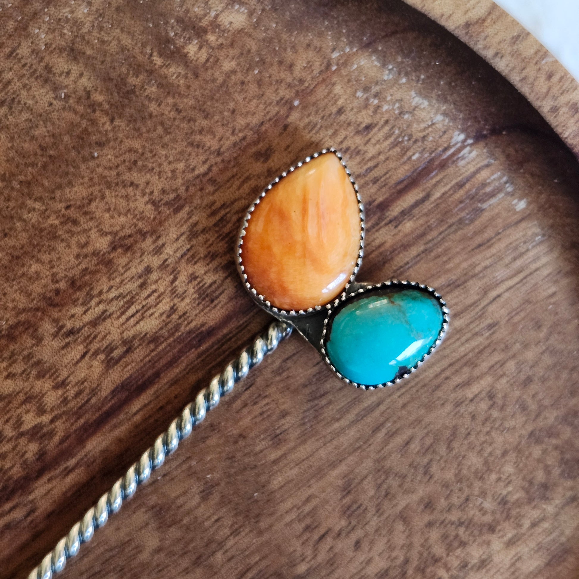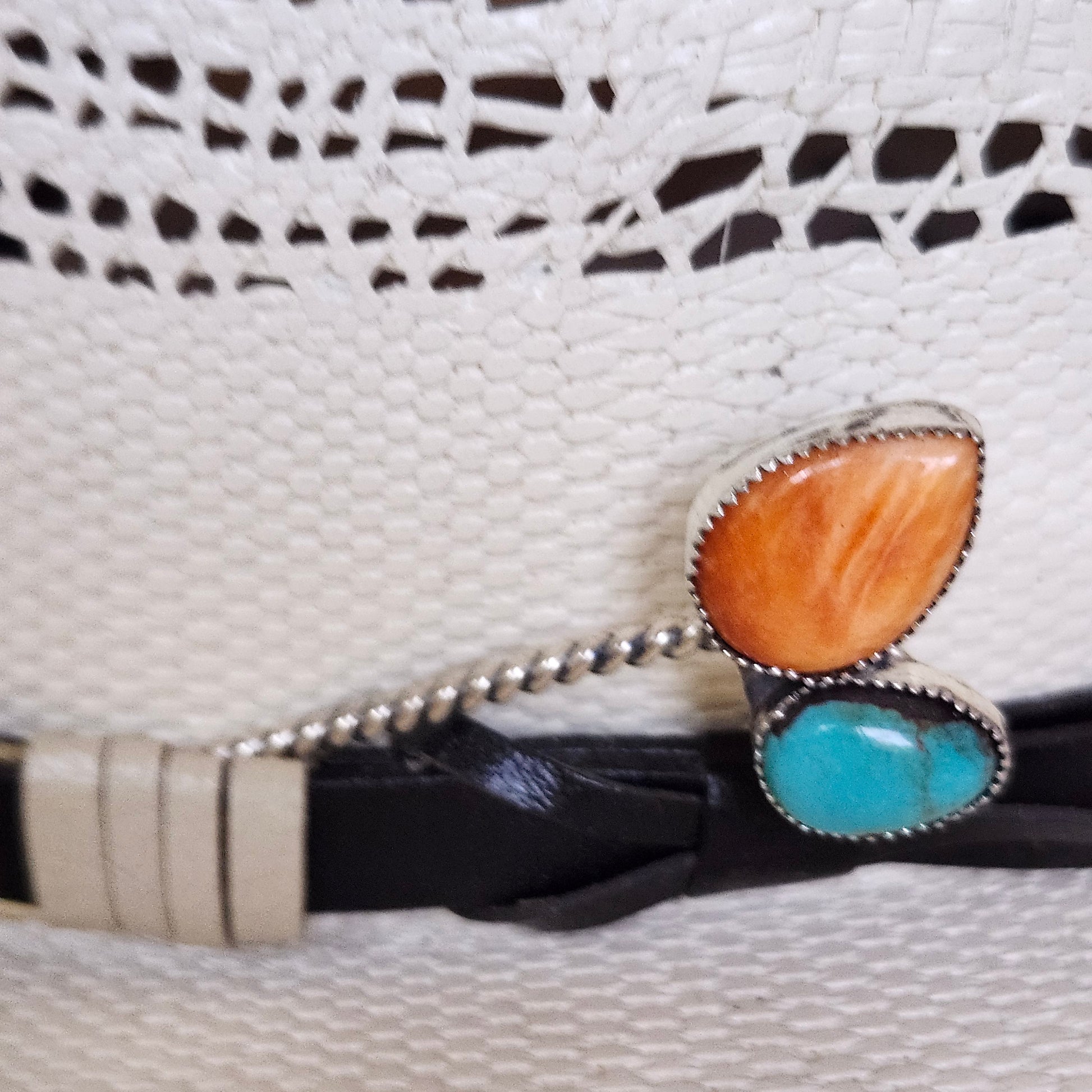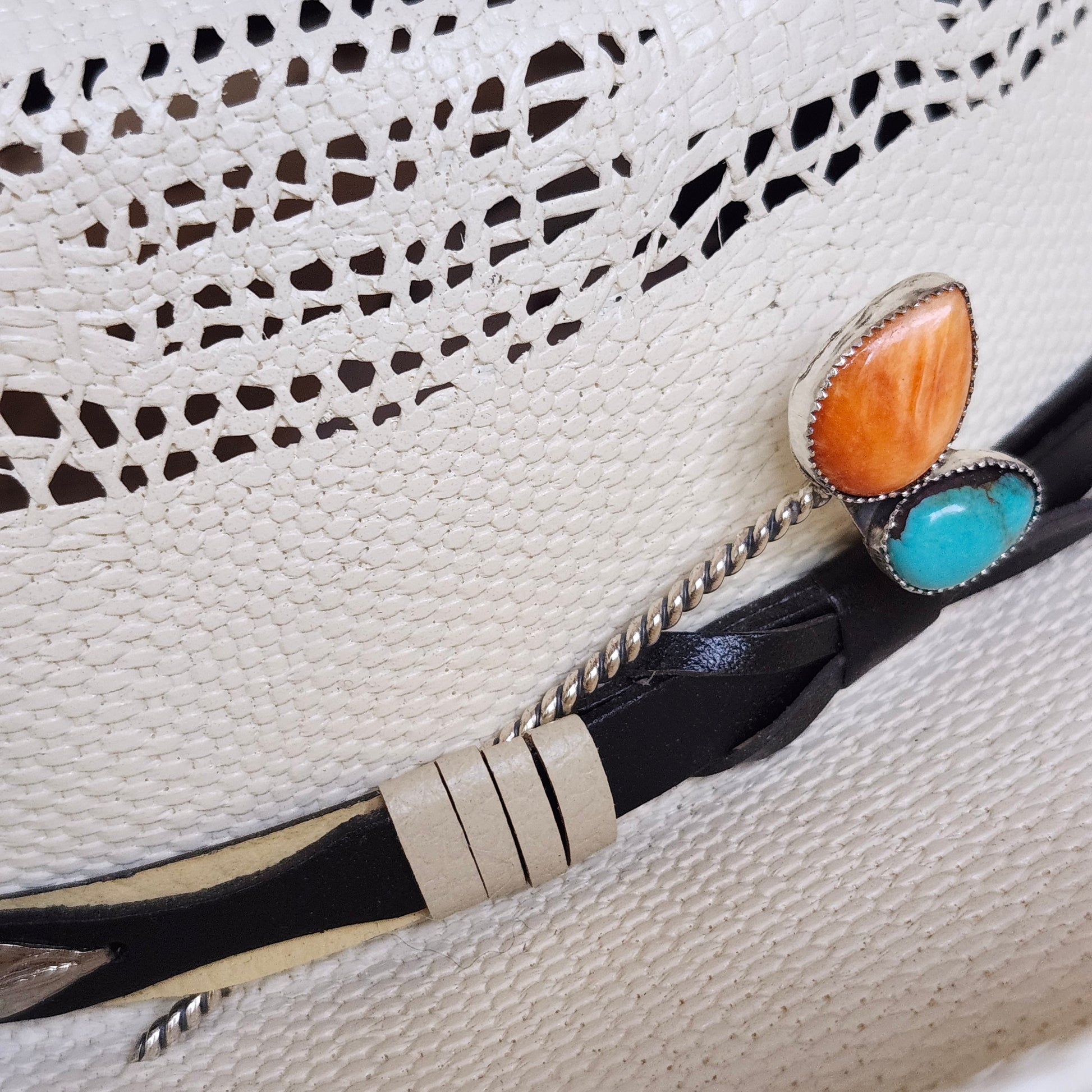 Ce petit bijou, conçu en argent sterling 925 et orné d'une pierre de la mine Kingman en Arizona et d'une coquille d'huître épineuse taillée, se place derrière la bande de votre chapeau de cowboy.