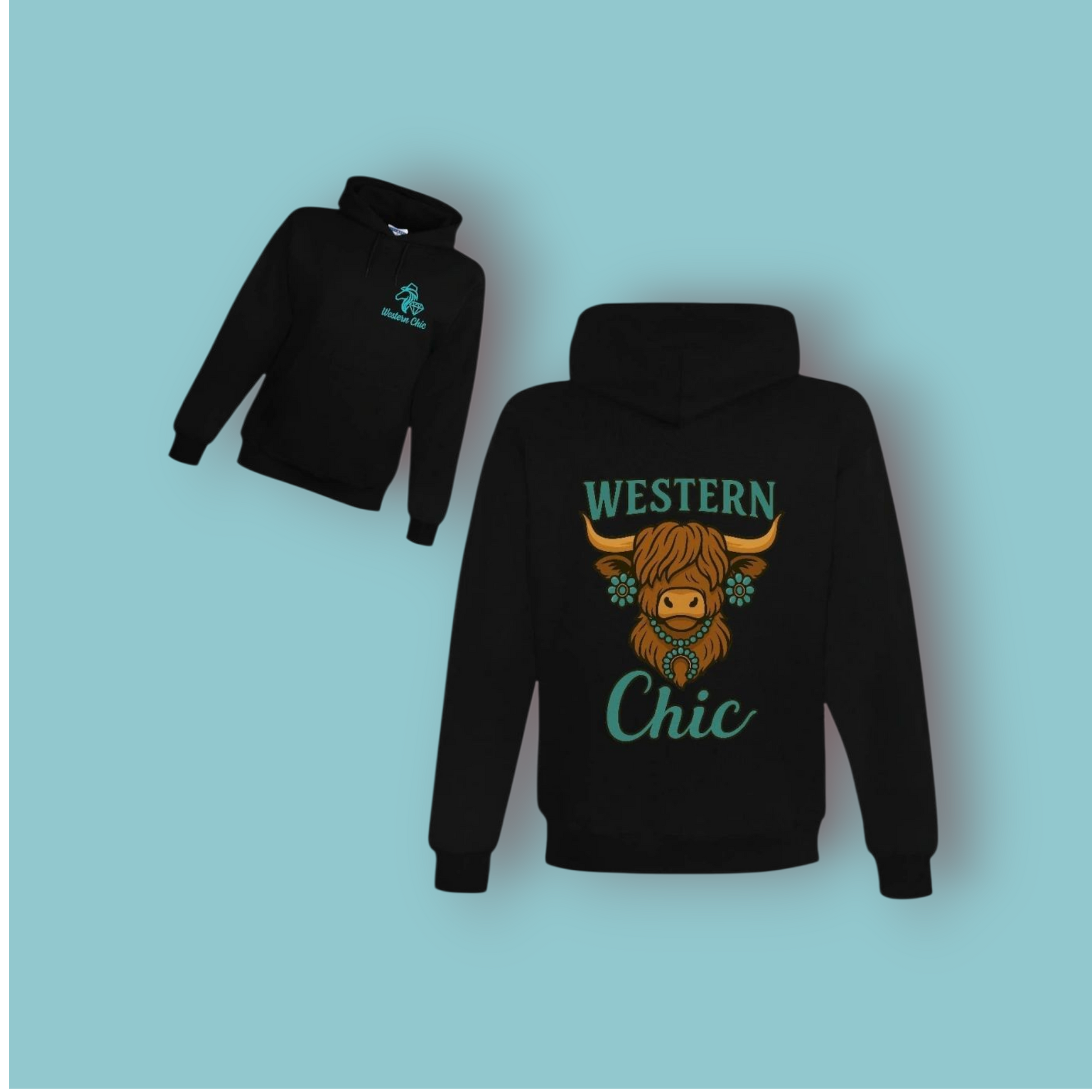 - Notre logo turquoise sur la poitrine sur le devant, design vache highland derrière